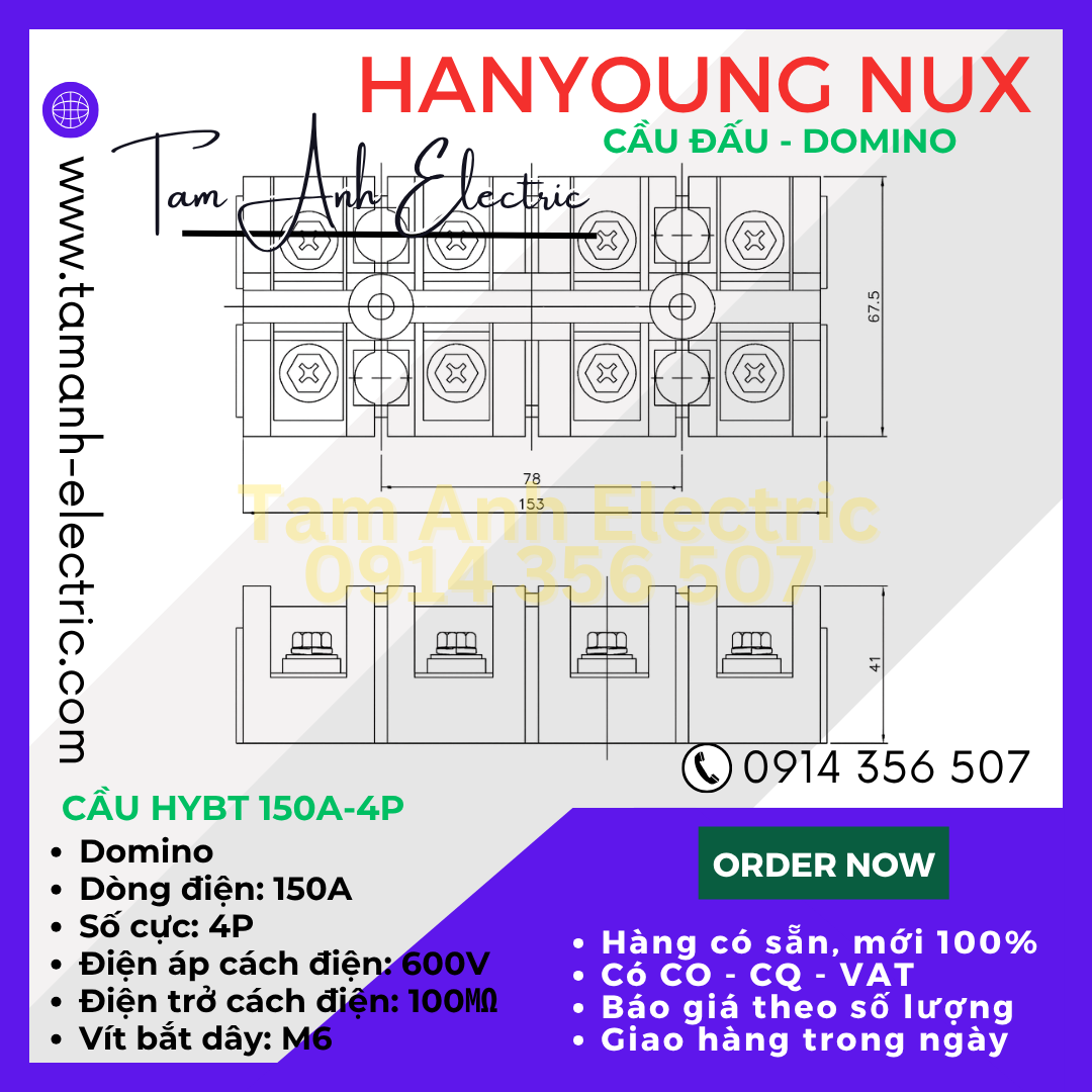 Cầu đấu Domino HYT-1504 HanYoung Hàn Quốc - Cầu Domino HYT 150A 4P HanYoung - Cầu 150A 4 mắt Hàn Quốc