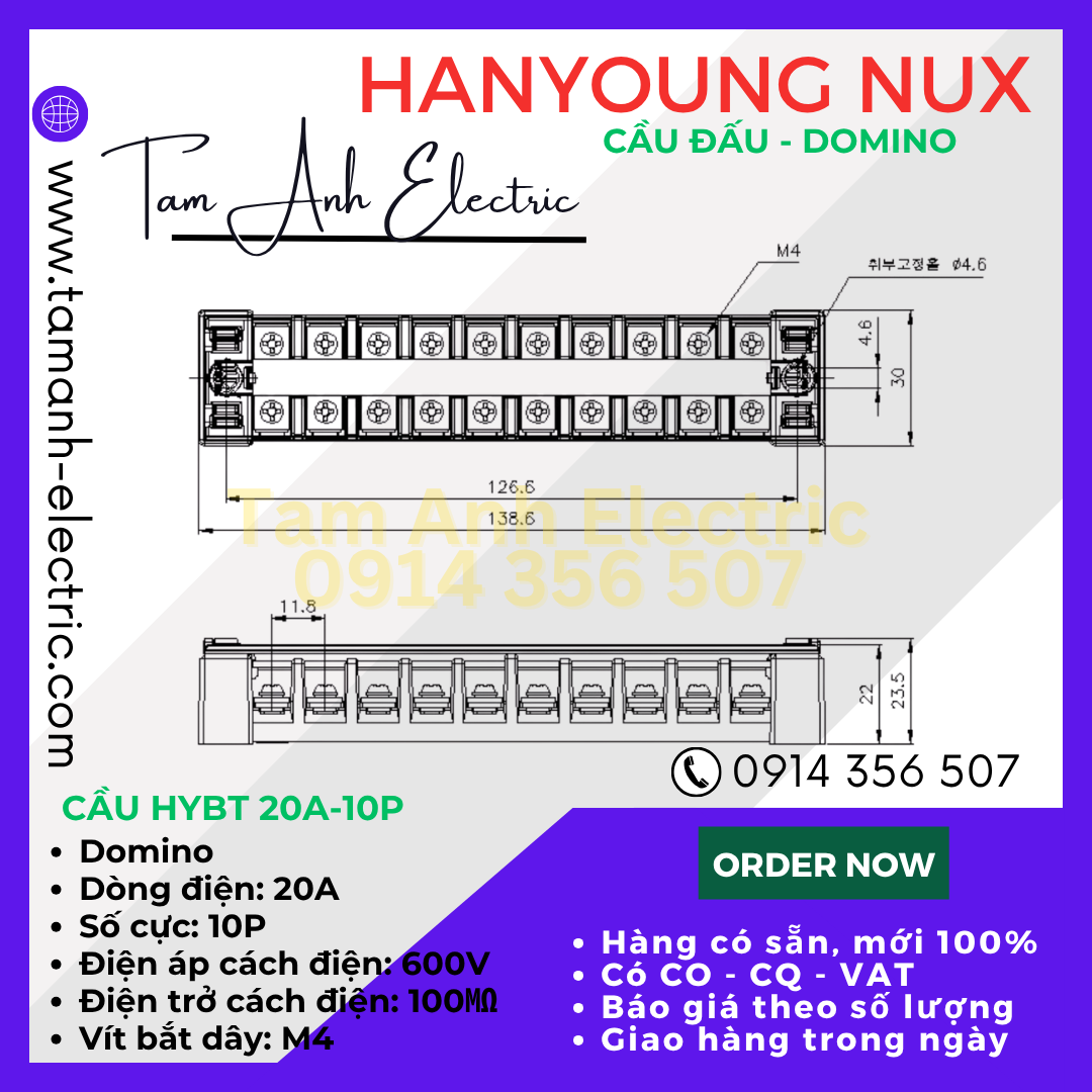 Cầu đấu Domino HYT-2010 HanYoung Hàn Quốc - Cầu Domino HYT 20A 10P HanYoung - Cầu 20A 10 mắt Hàn Quốc