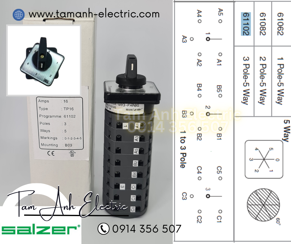 Chuyển mạch 0-1-2-3-4-5 - Công tắc xoay TP16 61102 - Chuyển mạch 6 vị trí Ấn Độ - Chuyển mạch Salzer